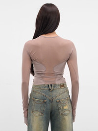 A smoke paneled sport top with lace-knit inserts and cut-out detailing, balancing semi-sheer structure with elongation and texture. Featuring: • Slim fit • Paneled mixed-material construction • Signature cut-outs and lace-knit detailing • Semi-sheer paneling • Round neck • Elongated sleeves with thumbholes • Made in China • Main: 77% Polyamide 23% Elastane | Secondary: 100% Polyester | Tertiary: 92% Polyamide 8% Elastane • Standard sizing Model is 5'8" wearing size S. Bust: 32" Waist: 26" Hips: 34.5"