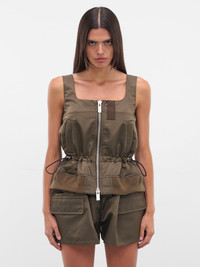Khaki tank top with a scoop neckline, zip front, and cinchable waist, finished with contrast orange lining. Featuring: • Relaxed fit • Scoop neck • Shoulder straps • Sleeveless cut with armholes • Front two-way zip closure • Front welt pockets • Cinched drawstring at waist • Rib-knit hem • Contrast orange lining • Made in Japan • 100% Nylon • Japanese sizing Model is 5'8" wearing size 1. Bust: 32.5" Waist: 24" Hips: 34"