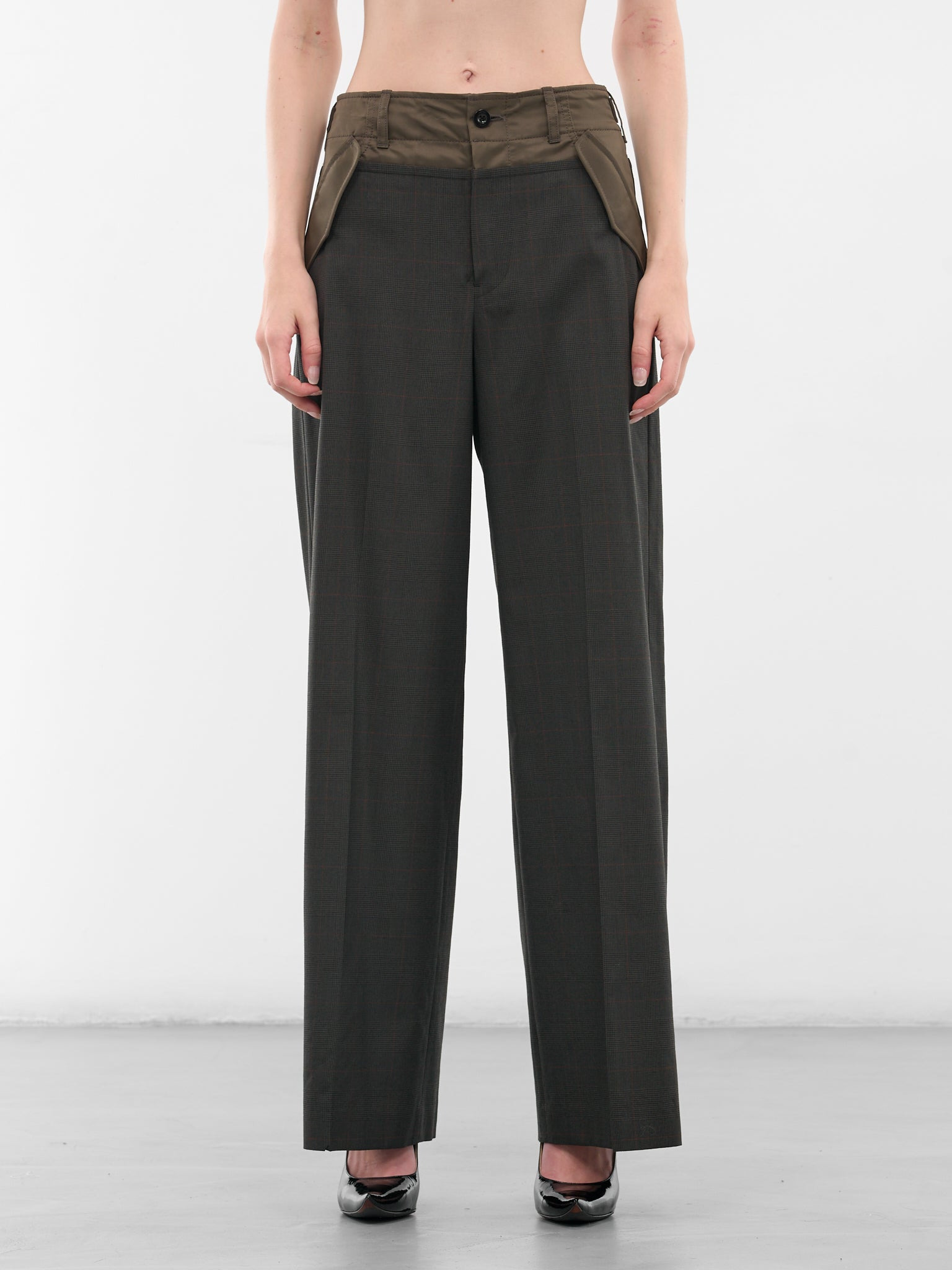 Khaki glen check pants with nylon paneling and attached pockets, cut wide through the leg with adjustable buckled sides. Featuring: • Baggy fit • Button and zip fly closure • Belt loops • Buckled side adjusters • Four-pocket styling • Nylon paneling with attached pockets • Made in Japan • Composition: 100% Wool | Attached parts: 100% Nylon | Lining: 100% Cupro | Filling: 100% Polyester • Japanese sizing Model is 5'9" wearing size 1. Bust: 32" Waist: 25" Hips: 34"