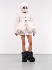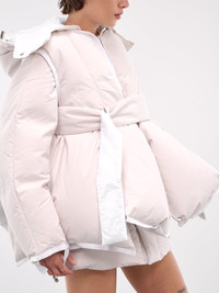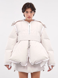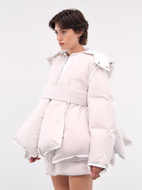SACAI jacket in ecru, paneled construction, padded & quilted, hood, adjustable drawcord, front concealed two-way zip closure, long sleeves, asymmetric hem, relaxed fit. Japanese Sizing Model is 5'8" wearing size 1. Bust: 32" Waist: 24" Hips: 36"