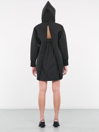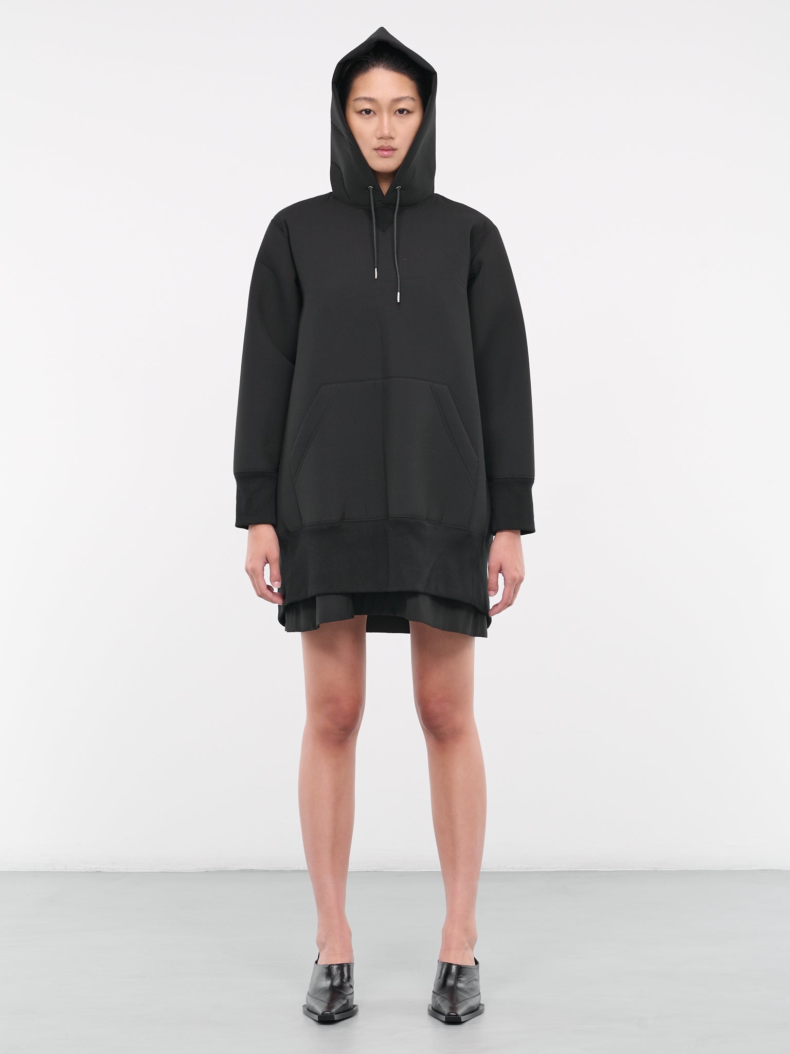 SACAI black sweater, layered design, oversized silhouette, cotton-blend, detachable satin slip, hooded collar, adjustable drawcord & spaghetti straps, kangaroo patch pocket, ribbed trim, back zip vent, mini length, regular fit. Made in Japan Body - 62% Cotton, 38% Polyester Slip - 100% Cupro Japanese Sizing Model is 5'10" wearing size 2. Bust: 31" Waist: 23.5" Hips: 35"