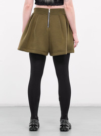 SACAI shorts in olive, cotton-blend, paneled jersey construction, high-waisted, elasticated rib-knit waistband, adjustable drawstring, back exposed zip closure, pleating, straight hem, mini-length, flared leg, baggy fit. Made in Japan Outer: 62% Cotton 38% Polyester Contrast: 60% Cotton 40% Nylon Japanese Sizing Model is 5'8" wearing size 2. Bust: 30" Waist: 24" Hips: 33.5"