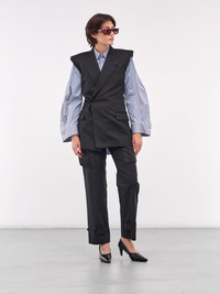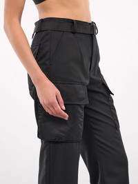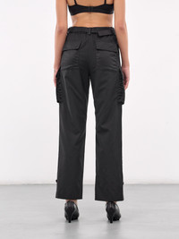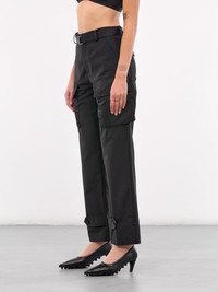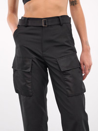 SACAI trousers in black, paneled nylon twill construction, high waist, belt loops, cinch belt, front concealed zip fly closure, inset pockets, back flap pockets, side cargo pockets, button straps, straight leg, slim fit. Japanese Sizing Model is 5'8" wearing size 1. Bust: 32" Waist: 24" Hips: 36"
