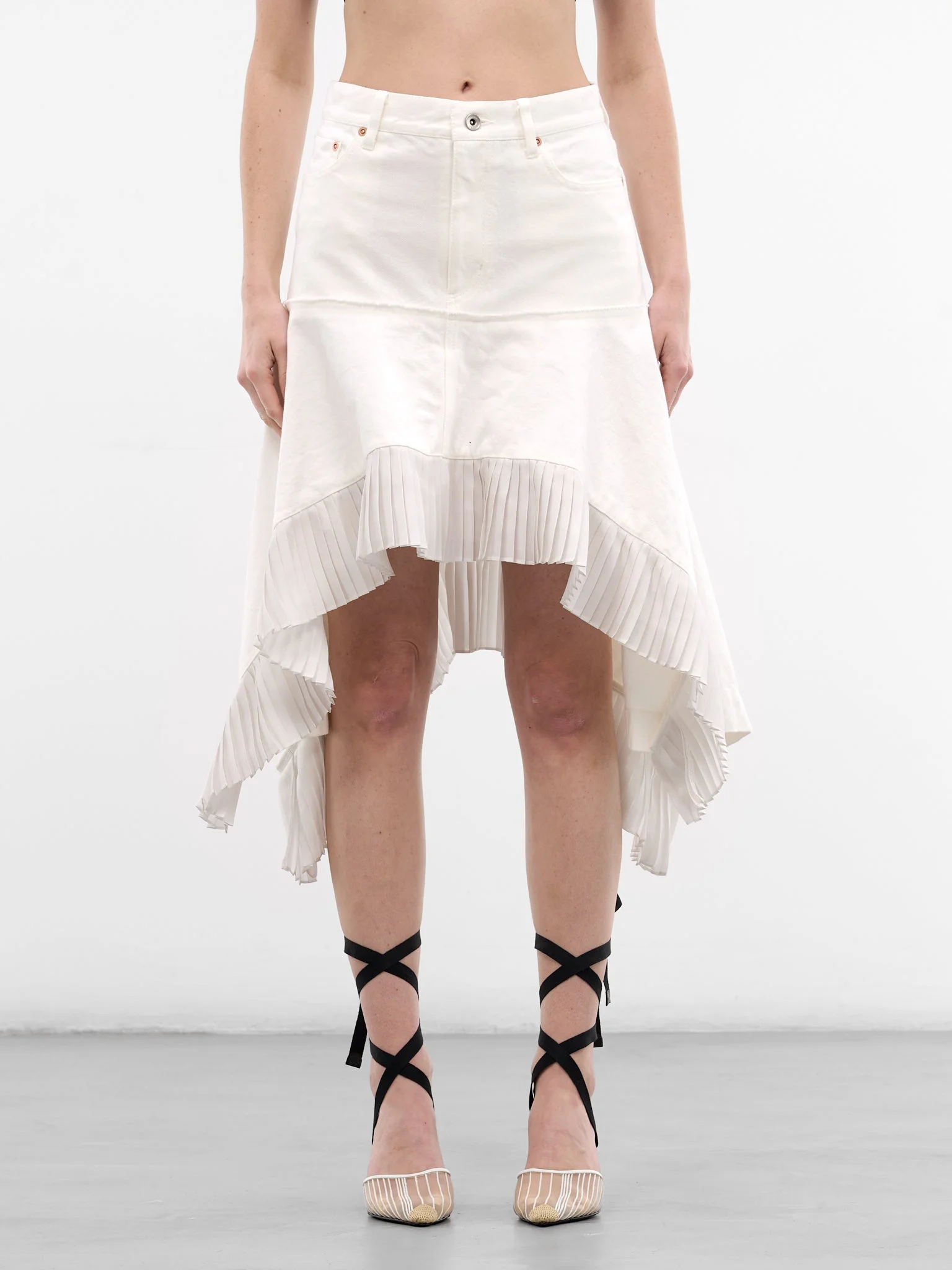 High-waisted denim skirt constructed with pleated satin contrast panels and an asymmetric handkerchief hem. Featuring: • Regular fit • Denim construction • High-waisted silhouette • Front button and zip fly • Five-pocket styling • Contrasting pleated satin panels at hem • Raw edge detailing throughout • Asymmetric handkerchief hem • Midi length • Made in Japan • Main: 100% Cotton | Trim: 100% Polyester • Japanese sizing Model is 5'8" wearing size 1. Bust: 32” Waist: 25” Hips: 35”