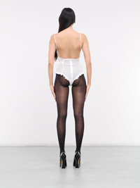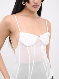 SHUSHU/TONG bodysuit in white, paneled polyester construction, sheer, sweetheart neckline, adjustable spaghetti straps, sleeveless, armscyes, back concealed zip closure, bust & hem ruffling, mid-cut, form fit. 100% Polyester UK Sizing Model is 5'8" wearing size 6. Bust: 32" Waist: 26" Hips: 34.5"
