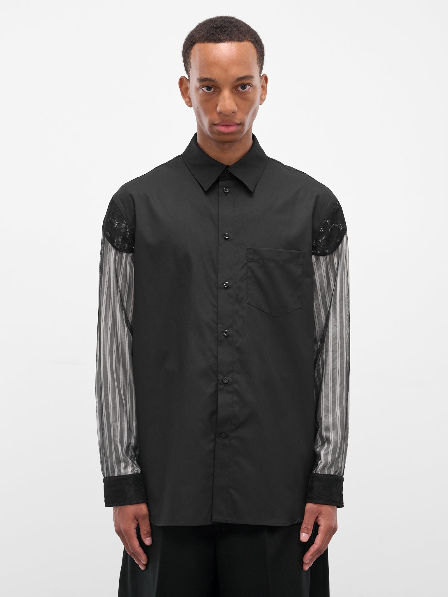 Black shirt with lace-paneled shoulders and striped contrast sleeves, cut relaxed with shirttail hem. Featuring: • Relaxed fit • Cotton blend construction • Pointed collar • Front button placket closure • Lace layering at shoulders • Striped contrast long sleeves with button cuffs • Chest pocket • Back yoke pleating • Shirttail hem • Made in Portugal • Material 1: 100% Cotton | Material 2: 100% Polyamide | Material 3: 100% Viscose | Material 4: 100% Polyester • Standard sizing Model is 6'1" wearing size M. Shoulders: 19" Chest: 33.5" Waist: 27.5"