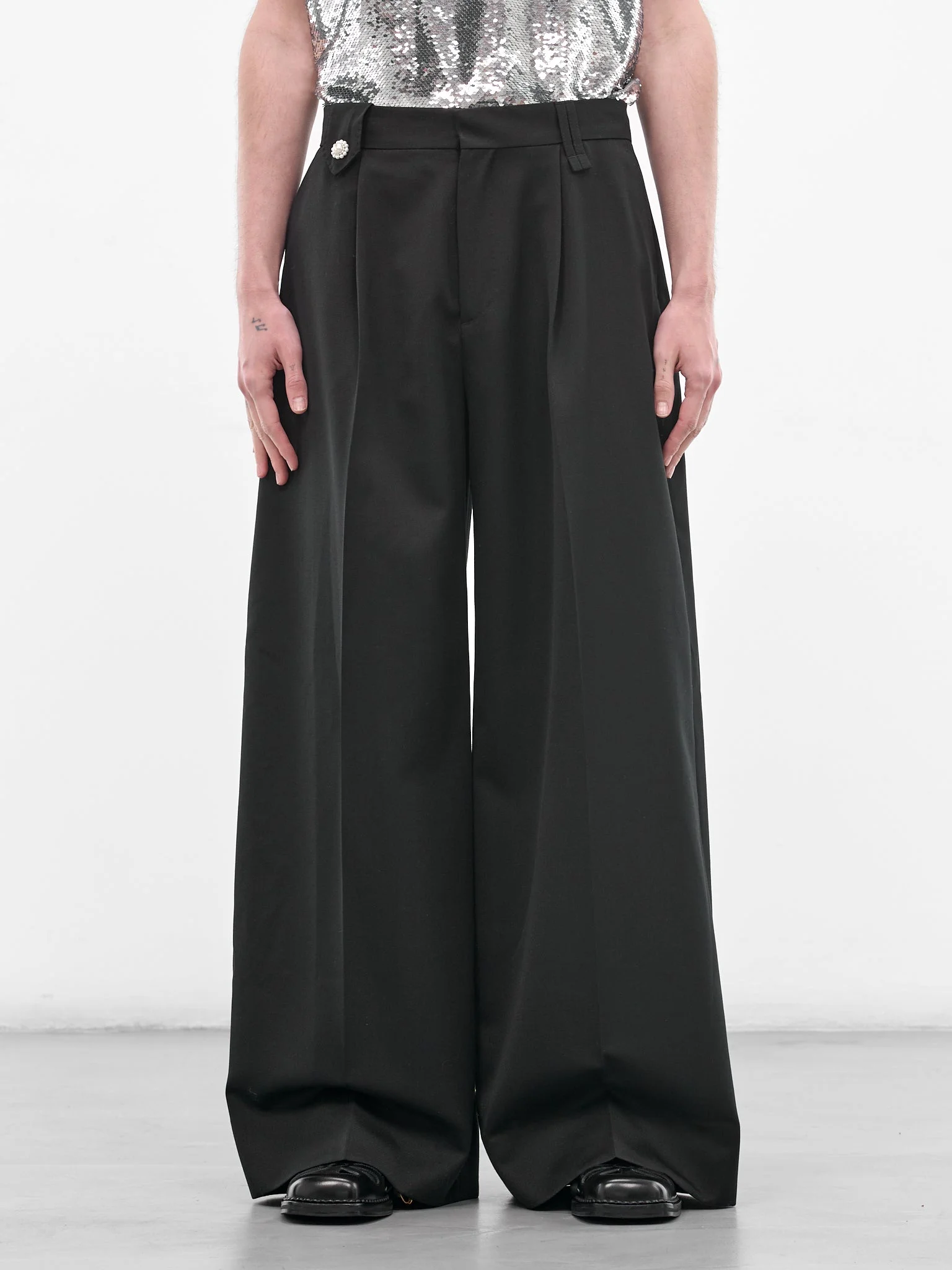 Venetian wool wide leg trousers with front pleats and faux pearl beading at belt loop tab. Featuring: • Tailored fit • High-waist • Wide leg • Front pleats • Faux pearl beading at front • Four-pocket styling • Cuffed turn up hem • Made in Portugal • Outer: 55% Polyester 45% Wool | Lining: 60% Acrylic 40% Copper • Standard sizing Model is 6'0" wearing size M. Shoulders: 17.5" Chest: 34.5" Waist: 29"