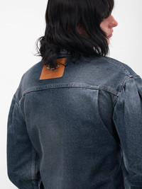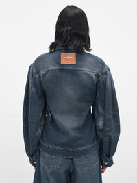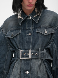 A blue denim biker jacket in a distressed wash with floral pearl and crystal embellishments at the collar. An integrated belt and signature puff sleeves balance the oversized silhouette. Featuring: • Oversized fit • Cotton denim construction • Distressed wash • Floral pearl and crystal embellishments • Signature puff sleeves • Beaded label at back • Pin-buckle belt fastening • Logo engraving at buckle • Flap and side pockets • Made in Portugal • 100% Cotton • UK sizing Model is 5'7" wearing size 6. Bust: 32" Waist: 25" Hips: 34"