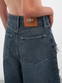 Vintage blue denim wide-leg jeans with a dirtied washed finish and distressed rips at the front. A beaded label detail complements the high-waisted, baggy silhouette. Featuring: • Baggy fit and wide leg • Cotton denim construction • Distressing throughout • Distressed rips at front • Beaded label at back and belt loops • High-waisted • Five-pocket styling • Front button and zip fly closure • Made in Portugal • 100% Cotton • UK sizing Model is 5'7" wearing size 6. Bust: 32" Waist: 25" Hips: 34"
