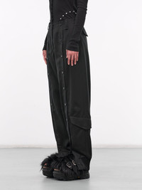 SIMONE ROCHA pants in black, poly-wool blend, paneled construction, belt loops, front concealed zip fly closure, side pockets, back flap pockets, front buttoned placket detailing, side flap pocket, tapered leg, loose fit. Made in Portugal Outer 1: 55% Polyester 45% Virgin Wool Rib: 100% Wool Inner: 60% Acetate 40% Cupro UK Sizing Model is 5'9" wearing size 8. Bust: 30" Waist: 23" Hips: 35"