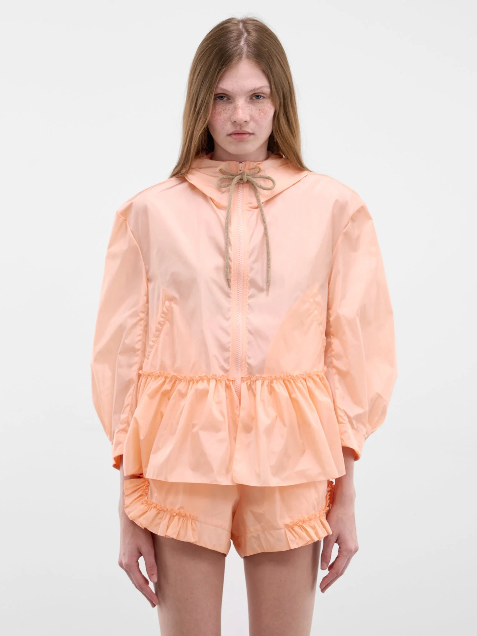 Lightweight cropped tech nylon jacket in structured fabrication with a peplum hem and chenille drawcord hood. Featuring: • Relaxed fit • Hood with drawstring • Front zip closure • Seasonal chenille bow • Ruffle detail throughout • Signature puff sleeve • Side pockets • Peplum hem • Made in Portugal • Outer: 100% Polyamide • UK sizing Model is 5'8" wearing size 8. Bust: 29” Waist: 23” Hips: 33.5”