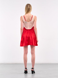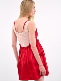 SIMONE ROCHA dress in red, layered silk & satin construction, patchwork pattern, scoop neck, layered shoulder straps, sleeveless, armscyes, back concealed zip closure, hem gathering & frilling, side self-tie fastenings, ruffled hem, relaxed fit. Made in Portugal Material 1: 100% Silk Material 2: 100% Viscose UK Sizing Model is 5'8" wearing size 8. Bust: 32" Waist: 24" Hips: 35"