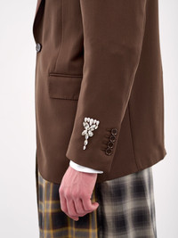 SIMONE ROCHA blazer in chocolate, poly-wool blend, paneled construction, peaked lapel, back collar pearl embellishment, structured shoulders, long sleeves, surgeon's cuffs, cuff rhinestone & pearl embellishment, front button closure, chest welt pocket, side welted flap pockets, back stitched vent, straight hem, lined, relaxed fit. Made in Portugal Outer: 55% Polyester 45% Virgin Wool Inner: 100% Viscose Standard Sizing Model is 6'1.5" wearing size M. Shoulders: 18.5" Chest: 37" Waist: 31"