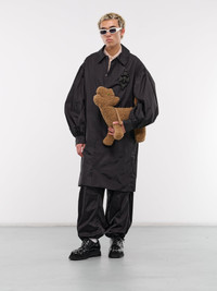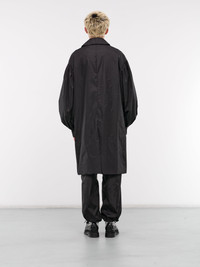 SIMONE ROCHA coat in black, paneled tech nylon construction, spread collar, front buttoned placket closure, long puff sleeves, chest embroidered embellishment, back vent, straight hem, lined, relaxed fit. Made in Portugal Outer: 100% Polyamide Inner: 60% Acetate 40% Cupro Standard Sizing Model is 5'11" wearing size M. Shoulders: 18" Chest: 36" Waist: 27"