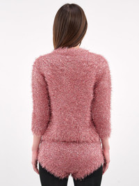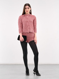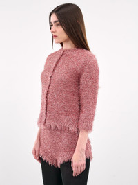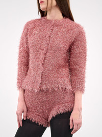 SIMONE ROCHA jacket in pink, nylon-metal blend, paneled tinsel knit construction, soft & fuzzy yarn, round neck, front button closure, long sleeves, straight hem, slim fit. Made in Portugal 55% Polyamide 45% Metalized Fiber Standard Sizing Model is 5'7" wearing size S. Bust: 30" Waist: 24" Hips: 35"