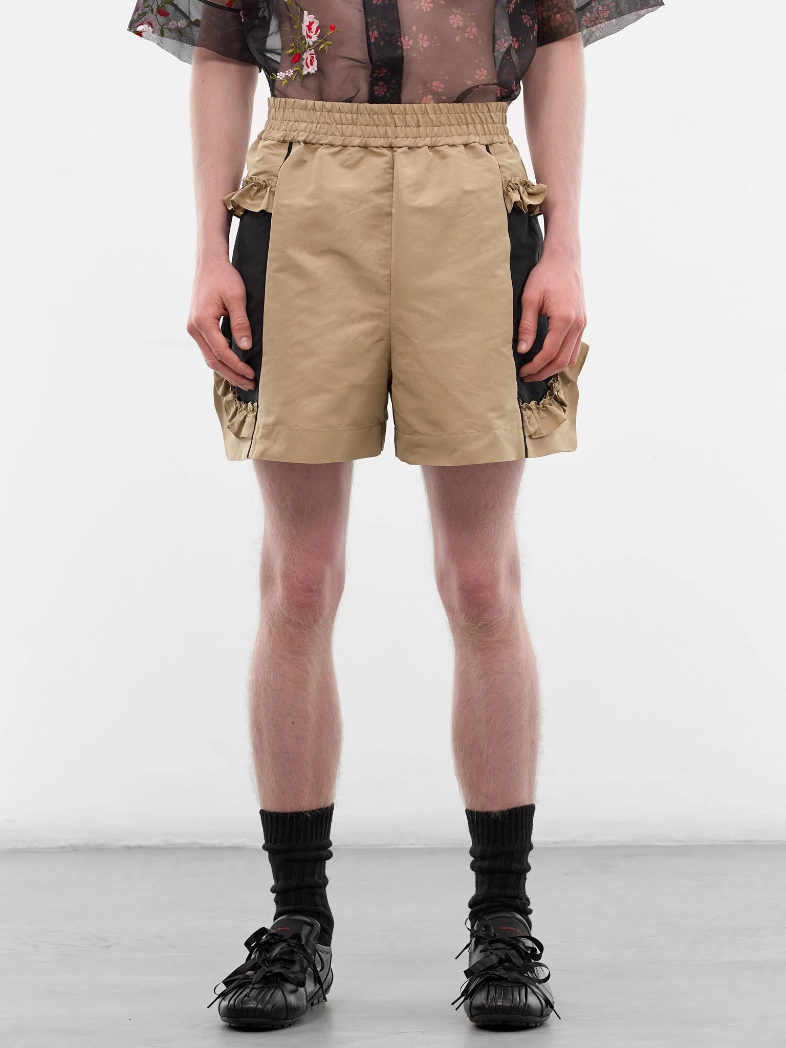 Track shorts in black and beige with paneled polyester construction and side ruffle frill detailing. Featuring: • Relaxed fit • Paneled polyester construction • Contrast two-tone paneling • Elasticated waistband • Side ruffled frill embellishment • Side pockets • Side vents • Above-knee length • Wide leg • Made in Portugal • 100% Polyester • Standard sizing Model is 6'0" wearing size M. Shoulders: 19" Chest: 35" Waist: 28"