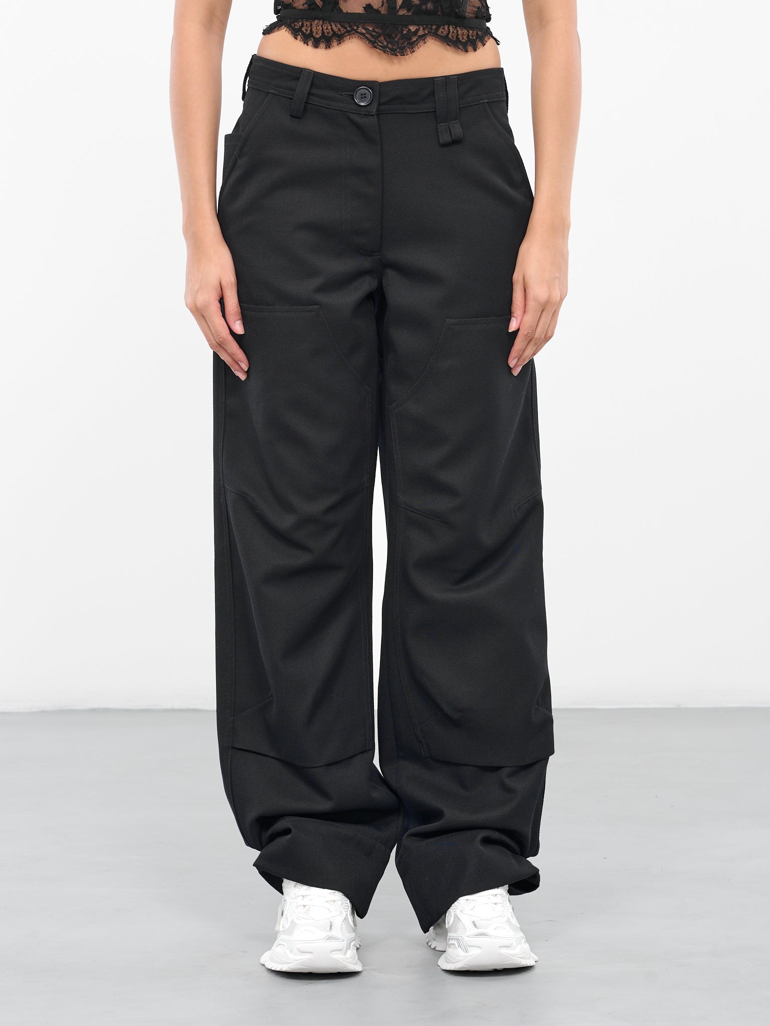 SIMONE ROCHA black pants, classic workwear design, patched knees, mid-waist, belt loops, button & zip-fly, five pockets, hammer loop, fold-over cuffs, straight leg, regular fit. 100% Cotton UK Sizing Model is 5'8" wearing size 8. Bust: 32" Waist: 26" Hips: 34.5"
