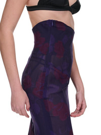 SITUATIONIST skirt in purple, rose print, semi-sheer, asymmetric waist & hemline, hook & eye detail, side seam closure, mini length, slim fit. Italian Sizing Model is 5'11" wearing size 36. Shoulders: 18" Chest: 34" Waist: 29"