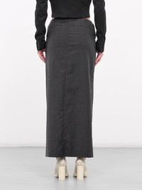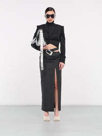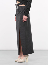 SITUATIONIST skirt in grey, paneled wool construction, high-waisted, cross-over straps & adjustable buckle, front slit, back vent, straight hem, maxi-length, slim fit. Made in Georgia 100% Wool French Sizing Model is 5'7" wearing size 36. Bust: 31" Waist: 24" Hips: 30"
