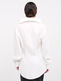 SITUATIONIST shirt in white, paneled viscose-blend construction, v-neckline, modified shirt collar, front buttoned placket closure, long sleeves, barrel cuffs, bodice darting, curved hem, relaxed fit. Made in Georgia 70% Viscose 20% Polyester 10% Cotton French Sizing Model is 5'7" wearing size 36. Bust: 31" Waist: 24" Hips: 30"