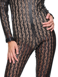 SITUATIONIST bodysuit in black, lace design, semi-sheer, seam detailing, stand neck collar, long sleeves, back zip closure, sculpted-fit. Made in Georgia Italian Sizing Model is 5'9" wearing size 36. Bust: 32" Waist: 24" Hip: 34"