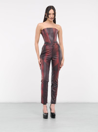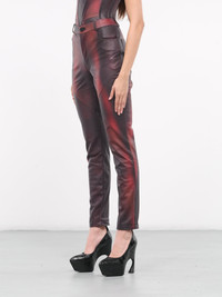 YASPIS x SITUATIONIST purple & burgundy trousers, paneled leather construction, dégradé effect, high-waisted, belt loops, front button & concealed zip fly, inset pockets, back patch pockets, tapered leg, slim fit. Made in Georgia French Sizing Model is 5'8" wearing size 36. Bust: 32" Waist: 26" Hips: 34.5"