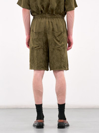 SONG FOR THE MUTE shorts in khaki, paneled cupro-blend construction, antique floral pattern, elasticated drawstring waistband, concealed fly, inset pockets, back patch pockets, raw hem detailing, lined, knee-length, straight leg, relaxed fit. Made in Australia 52% Cupro 24% Rayon 24% Linen Italian Sizing Model is 6'1.5" wearing size 48. Shoulders: 18.5" Chest: 37" Waist: 31"
