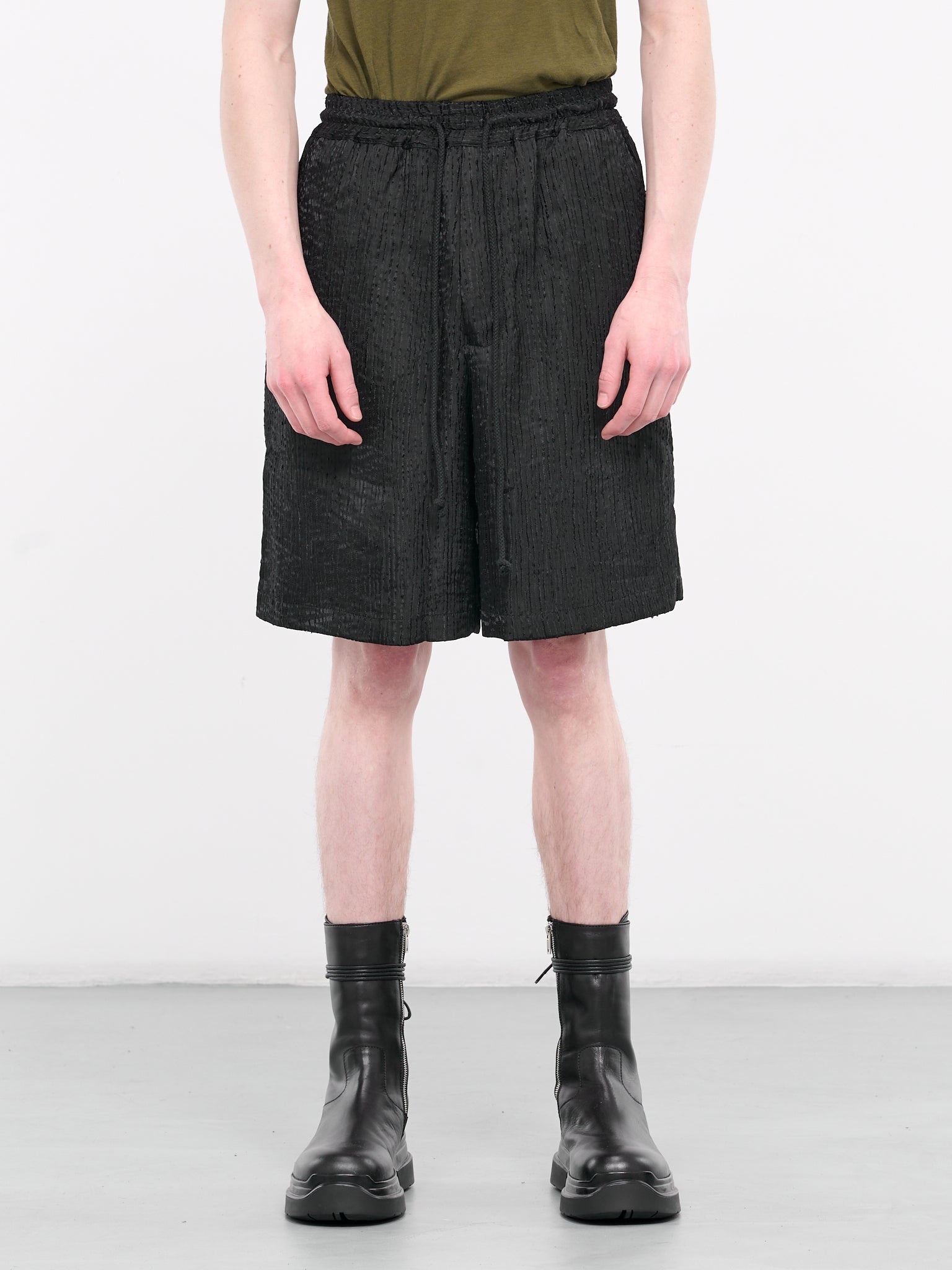 SONG FOR THE MUTE shorts in black, Japanese nylon, paneled nylon construction, wave texturing, elasticated waistband, adjustable drawstring, inset pockets, back patch pockets, straight hem, lined, straight leg, baggy fit. Made in Australia Outer: 100% Nylon Inner: 100% Cupro European Sizing