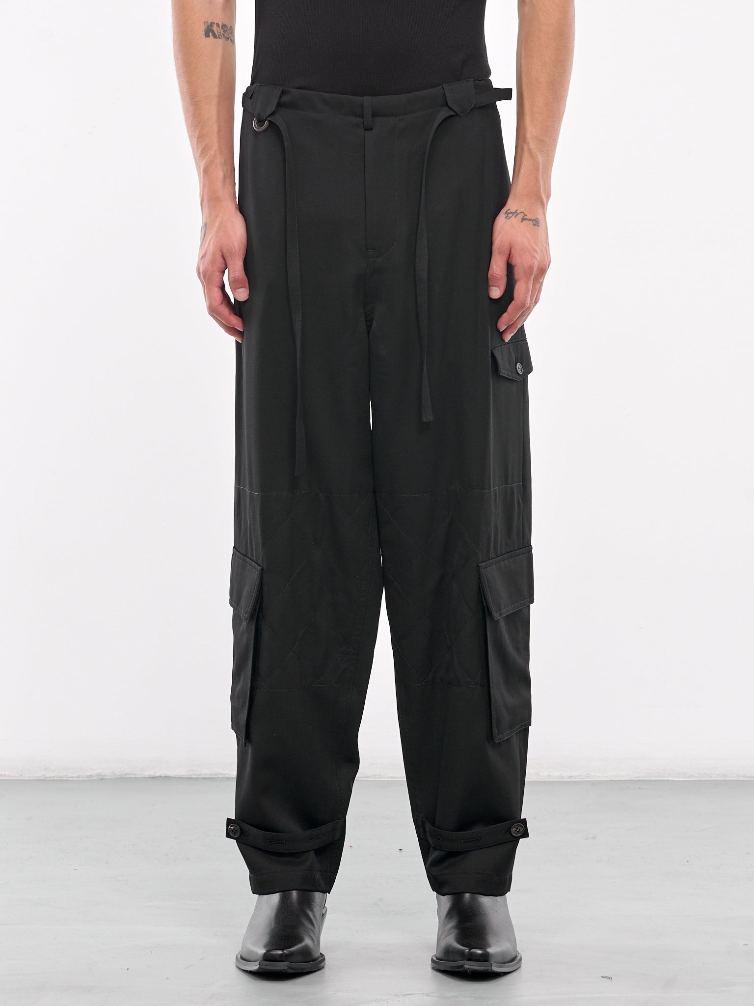 SOSHI OTSUKI pants in black, paneled wool construction, belt loops, self-tie drawstring, front zip fly, side pockets, back flap pockets, side cargo pockets, hem buttoned straps, tapered leg, loose fit. Made in China Outer: 100% Wool Parts: 100% Cotton European Sizing Model is 6'2" wearing size 46. Shoulders: 19" Chest: 38" Waist: 30"