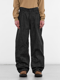 Indigo denim trousers with pleated construction and wide leg. Featuring: • Baggy fit • Wide leg • Belt loops • Front button and zip fly closure • Pleated • Inset pockets • Back welt pockets • Made in Japan • 100% Cotton • Standard sizing Model is 6'0" wearing size M. Shoulders: 19" Chest: 35" Waist: 28"