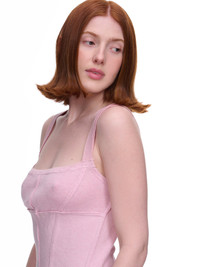TALIA BYRE dress in pink, corset design, boning details, knit construction, square neckline, side slits, maxi length, slim fit. Standard Sizing Model is 5'7" wearing size S. Bust: 32" Waist: 25" Hip: 37"