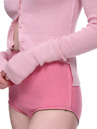TALIA BYRE sweater in pink, stretch-rib knit, round collar, tonal button closure, raw edges, exposed seams, asymmetric hem, fitted. Standard Sizing Model is 5'7" wearing size XS. Bust: 32" Waist: 25" Hip: 37"