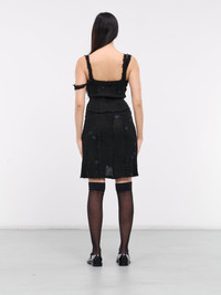 TALIA BYRE dress in black, paneled knit construction, semi-sheer, exposed seams & raw hem detailing, twin shoulder straps, sleeveless, armscyes, ruffled hem, mini-length, slim fit. Standard Sizing Model is 5'8" wearing size S. Bust: 32" Waist: 26" Hips: 34.5"