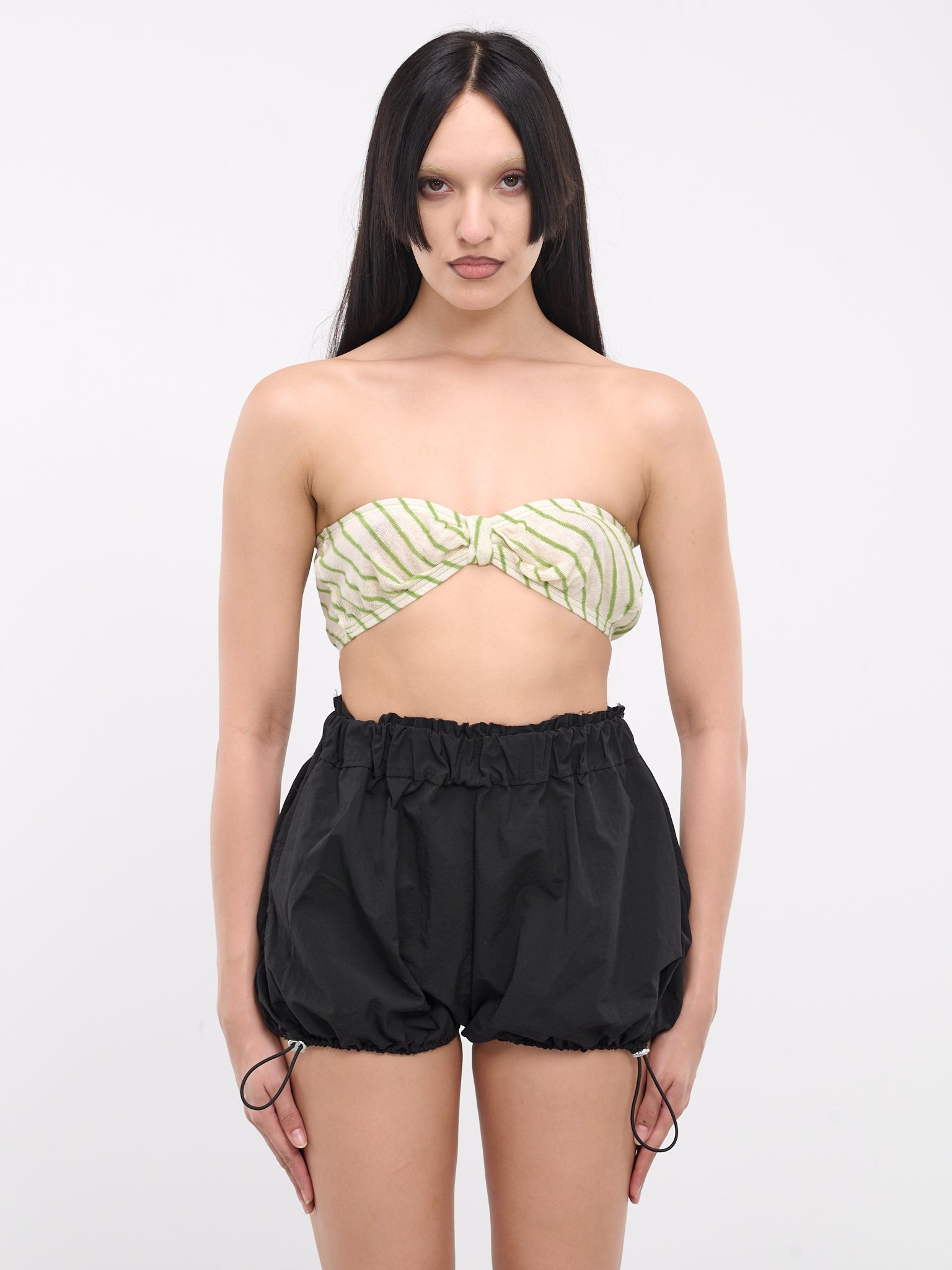 TALIA BYRE top in green & white, bandeau top design, paneled construction, stripe pattern, sweetheart neckline, strapless, front twisted detailing, high-low hem, cropped length, slim fit. European Sizing Model is 5'8" wearing size 40. Bust: 32" Waist: 26" Hips: 34.5"
