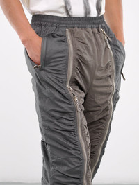 THUG CLUB joggers in khaki, paneled nylon construction, elasticated waistband, front exposed zip closure, side zip pockets, back welt pockets, leg ruching, rib-knit cuffs, tapered leg, loose fit. Made in South Korea 100% Nylon Numeric Sizing Model is 6'1" wearing size 2. Shoulders: 18" Chest: 36" Waist: 28"