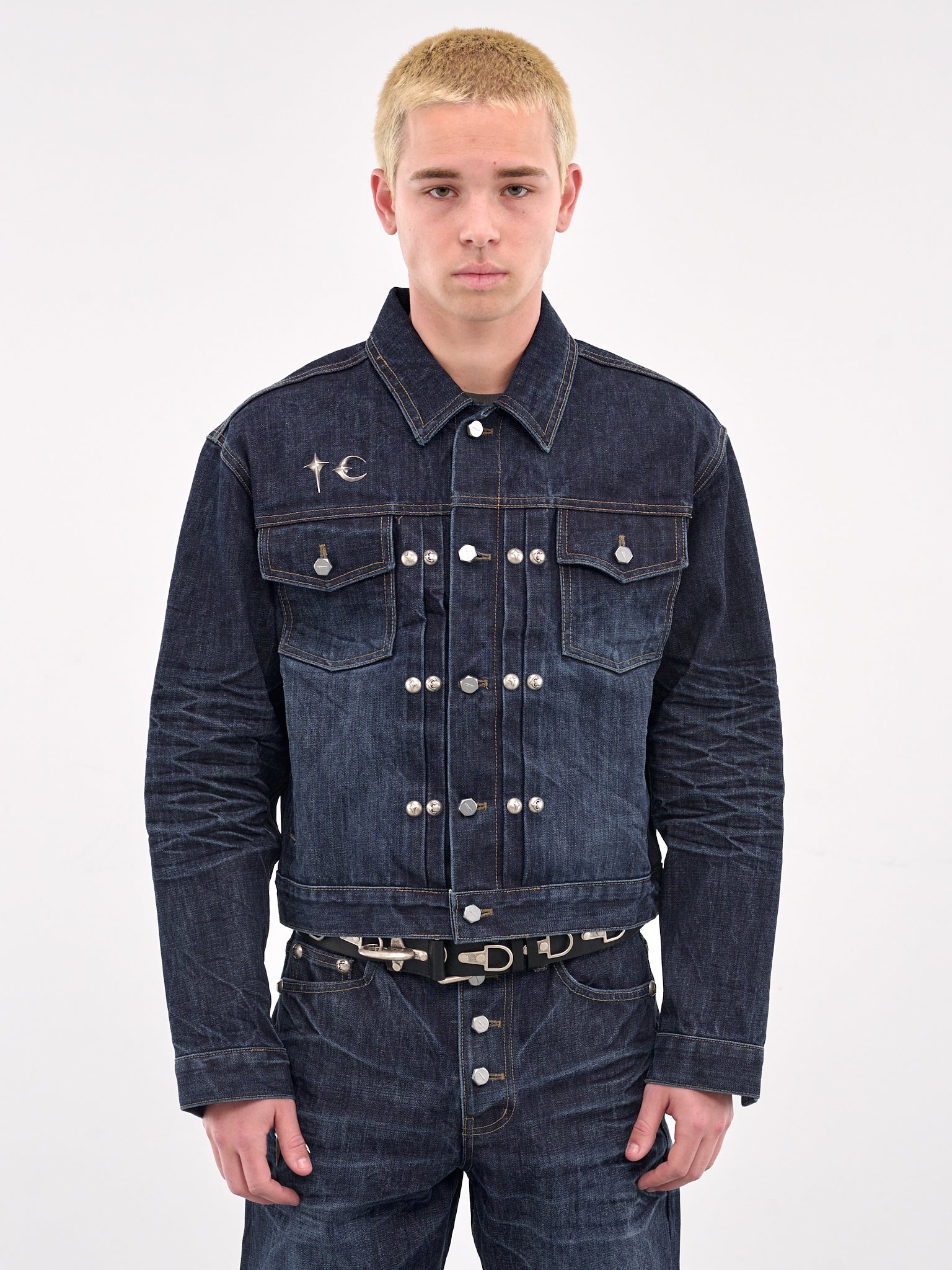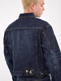 THUG CLUB jacket in blue, paneled denim construction, deep indigo wash, faded, spread collar, front buttoned placket closure, long sleeves, press-stud cuffs, chest metal logo plaque, silver-tone hardware, front buttoned flap pockets, front logo-engraved stud detailing, side welt pockets, hem adjustable button straps, back hem logo patch, straight hem, slim fit. Made in South Korea 100% Cotton Numeric Sizing Model is 6'0" wearing size 2. Shoulders: 18" Chest: 36" Waist: 28"