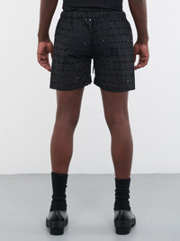 TOKYO JAMES shorts in black, lace construction, elastic waist, tonal adjustable drawcord, side seam pockets, short length, regular fit. Standard Sizing Model is 6’0” wearing size M. Shoulders: 18” Chest: 33” Waist: 28”