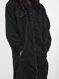 TOKYO JAMES coat in black, sparkly knit construction, stand collar, dual chest pockets, snap button closure, side seam pockets, ribbed elastic trim, back dual vents, full length, relaxed fit. Standard Sizing Model is 6’0” wearing size M. Shoulders: 18” Chest: 33” Waist: 28”