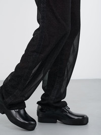 TOKYO JAMES pants in black, sparkly knit construction, semi-sheer, high-waist, button & zip-fly, belt loops, side seam pockets, back welt pockets, straight leg, regular fit. Standard Sizing Model is 6’0” wearing size M. Shoulders: 18” Chest: 33” Waist: 28”
