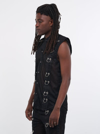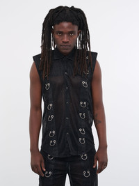 TOKYO JAMES vest in black, shirt design, sparkly knit construction, semi-sheer, pierced seam detailing, pointed collar, sleeveless, snap-button closure, curved hem, regular fit. Standard Sizing Model is 6’0” wearing size M. Shoulders: 18” Chest: 33” Waist: 28”