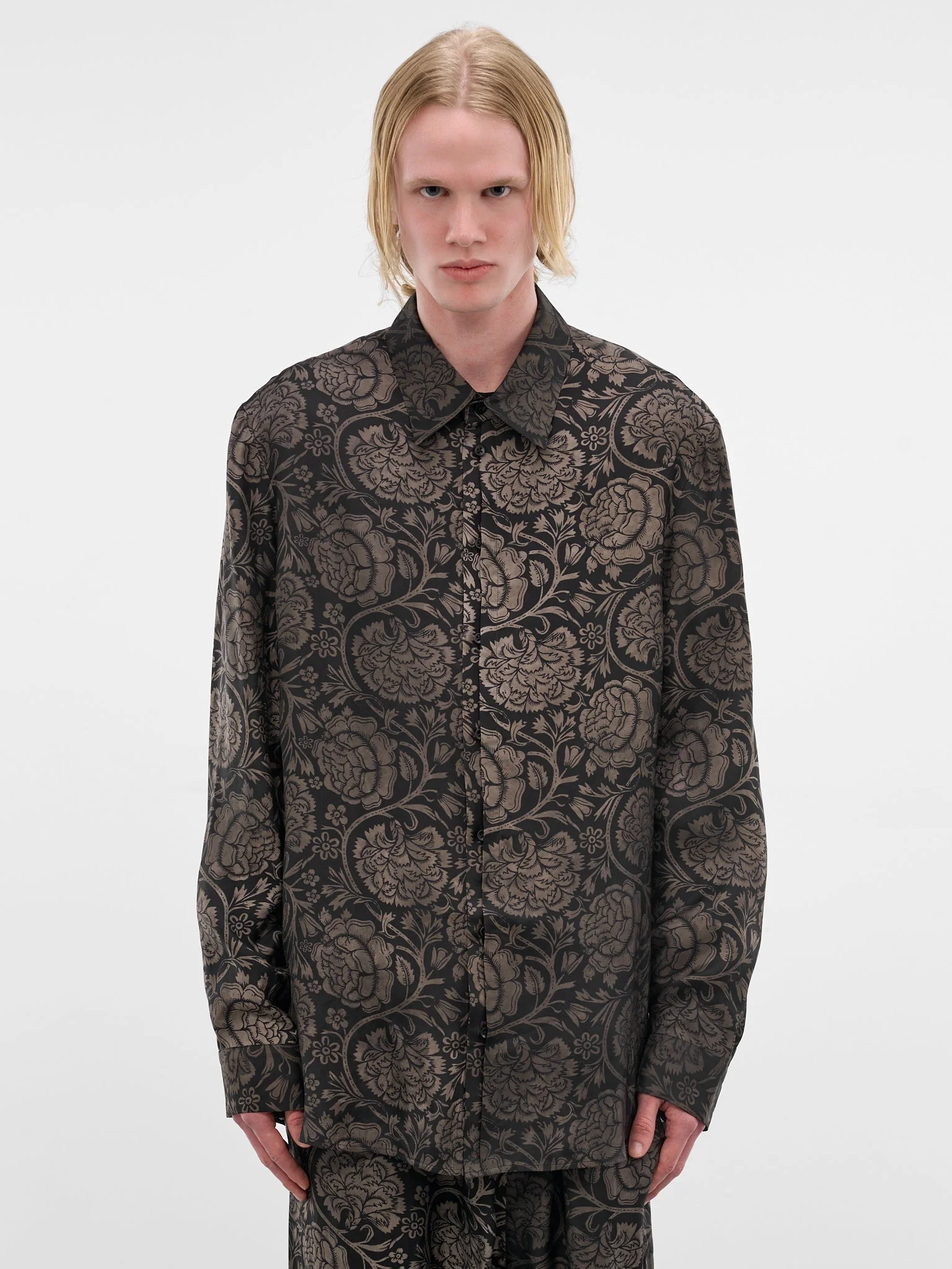 Black and tan tab shirt constructed in a viscose-cupro blend with an all-over flower pattern. Featuring: • Relaxed fit • Viscose-cupro construction • All-over flower pattern • Spread collar • Front button placket closure • Long sleeves with buttoned cuffs • Back yoke pleating • Shirttail hem • 50% Viscose 50% Cupro • Standard sizing Model is 6'0" wearing size M. Shoulders: 19" Chest: 35" Waist: 28"