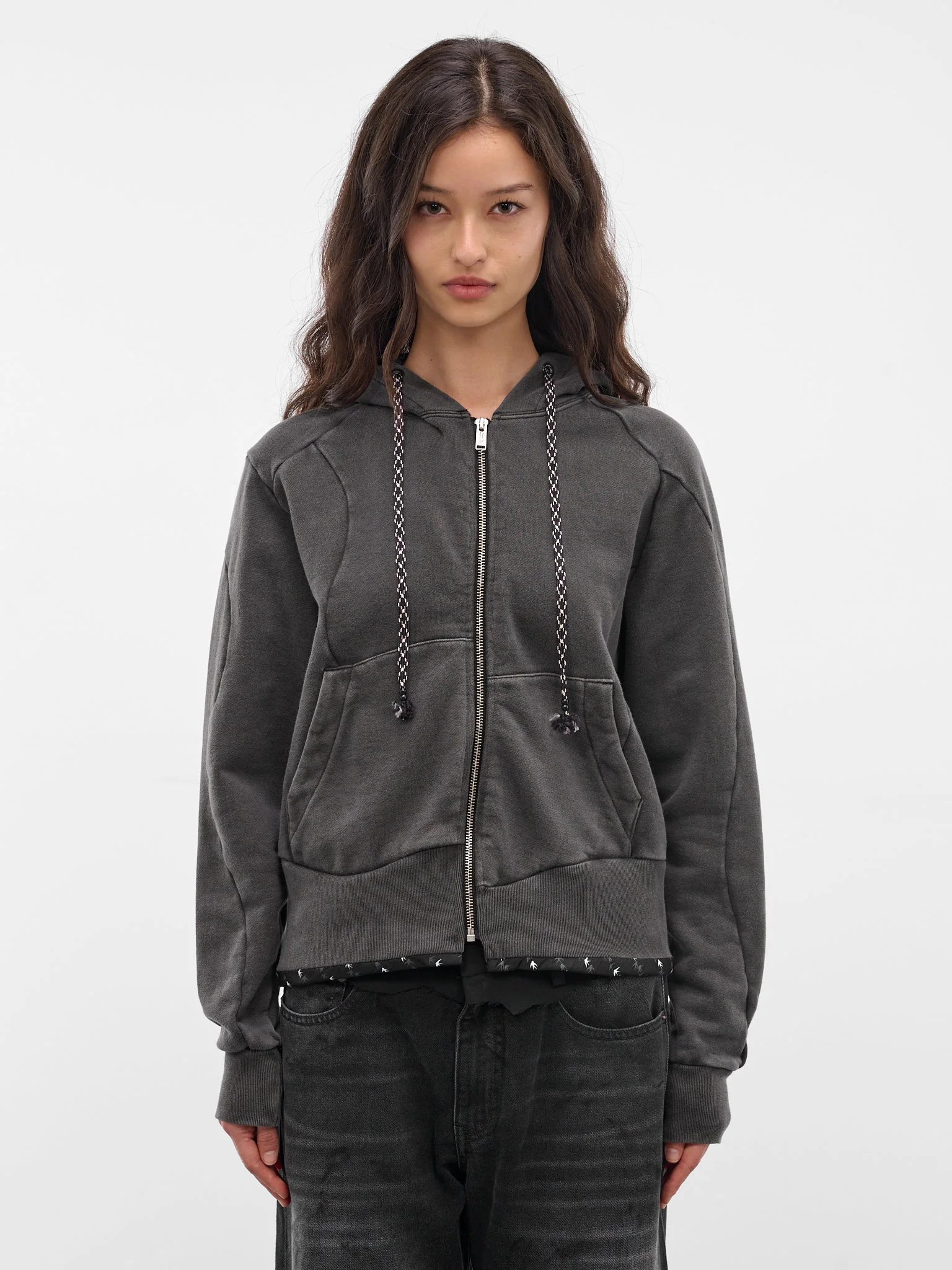 Zip-up hoodie in black with a cotton fleece construction, featuring asymmetric paneling and mixed-fabric lining. Featuring: • Relaxed fit • Cotton fleece construction • Asymmetric design and paneling • Hood with drawstring • Zip closure • Long sleeves • Rib-knit cuffs and hem • Kangaroo pockets • Cotton and silk lining with speech bubble design • Large tag at back • Made in Japan • Main: 100% Cotton | Filling: 100% Polyester | Lining: 70% Cotton 30% Silk | Rib: 100% Cotton • Japanese sizing Model is 5'8.5" wearing size 1. Bust: 32” Waist: 24” Hips: 34”