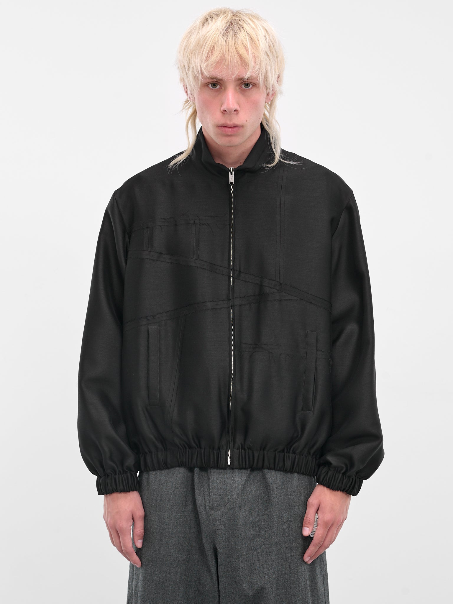 This black blouson jacket features asymmetric paneling and raw hems for a deconstructed aesthetic. The wool-silk blend construction includes a stand collar and elasticated cuffs for refined functionality. Featuring: • Relaxed fit • Asymmetric paneling with raw hems • Stand collar • Front zip closure • Long sleeves with elasticated cuffs • Elasticated hem • Side welt pockets • Made in Japan • Outer: 90% Wool 10% Silk | Lining: 100% Cupro • Japanese sizing Model is 6'0" wearing size 4. Shoulders: 19" Chest: 38" Waist: 30