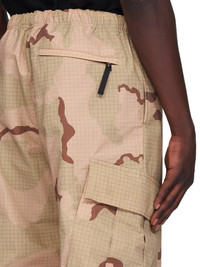 Undercover joggers in beige, elasticized waistband, slash hand pockets, zipped back pocket, straight leg silhouette, all over camo print. Made in Japan Japanese Sizing. Composition: 100% Nylon. Model is 6'2" and wearing a size 3. Shoulders: 17" Chest: 33" Waist: 27"