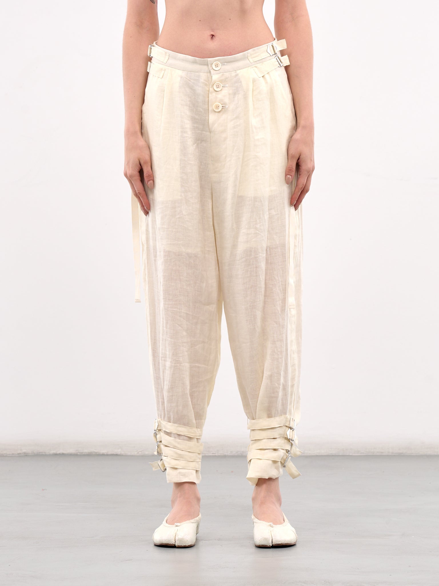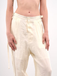 UNDERCOVER pants in off-white, paneled construction, front button fly closure, side cinch straps, inset pockets, back welt & flap pockets, pleated, cinch strap cuffs, tapered leg, loose fit. Japanese Sizing Model is 5'9" wearing size 1. Bust: 32" Waist: 23" Hips: 34"