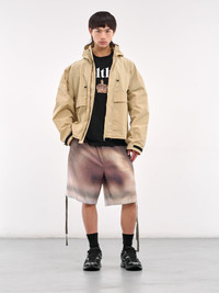 UNDERCOVER shorts in brown, paneled wool construction, gradient dye, elasticated waistband, concealed fly, side pockets, back flap & welt pockets, hem adjustable drawstring, straight hem, knee-length, wide leg, relaxed fit. Made in Japan 100% Wool Japanese Sizing Model is 6'1" wearing size 3. Shoulders: 18" Chest: 36" Waist: 30"