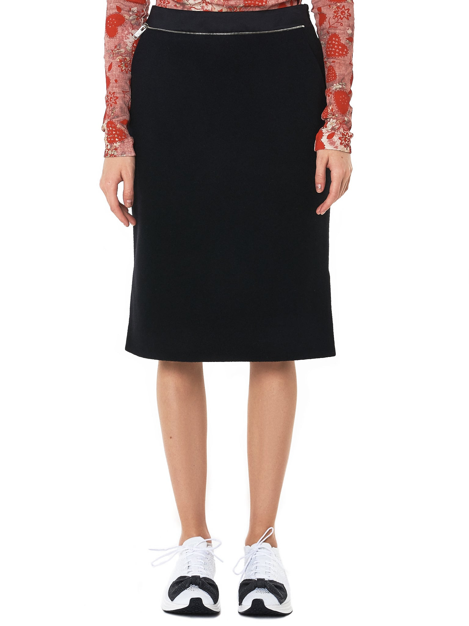 Undercover mid-length skirt in black on wool-nylon blends featuring a superfluous waist zip detail, side zip closure, hip pockets, rear hem tier panels, vented sides, and tonal stitching on a subtle bell silhouette. Composition - 80% Wool, 20% Nylon Model wears a size 2.