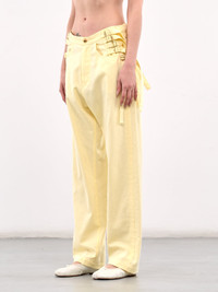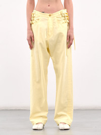 UNDERCOVER Yellow Belted Cotton-Linen Jeans These relaxed yellow jeans are constructed from a blend of cotton, linen, and rayon. Rendered with a straight leg and detailed with adjustable cinch straps throughout. Straps for cinching across the waist allow a variety of draping styles. Featuring: • Relaxed fit • Straight leg • Buckled cinch straps at waist • Four-pocket style • Button fastening and concealed zip fly closure • Made in Japan • 50% Cotton 25% Linen 25% Rayon • Japanese Sizing Model is 5'8" wearing size 1. Bust: 32" Waist: 24" Hips: 35"