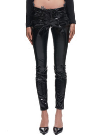 Unravel lace-up latex skinny jeans in black, constructed of synthetic latex/patent and cotton fabrics, glossy latex/patent front fabric panel, adjustable waist with bodycon/corset lace-up drawstring closure system, layered fly flap, belt loops, front slash hand pockets, front zippered pockets, rear denim fabric panel, rear pockets, straight hem, tonal stitching. Made in Italy. Composition - 76% Cotton, 22% Polyester, 2% Elastane (Main); 80% Polyamide, 20% Elastane (Secondary Fabric); 65% Polyester, 35% Cotton (Additional fabric); 56% Viscose, 24% Cotton, 10% Acrylic, 10% Acetate (Additional Fabric) Model is 5ft 8” and wearing a size 25. Bust: 32” Waist: 26” Hip: 36"