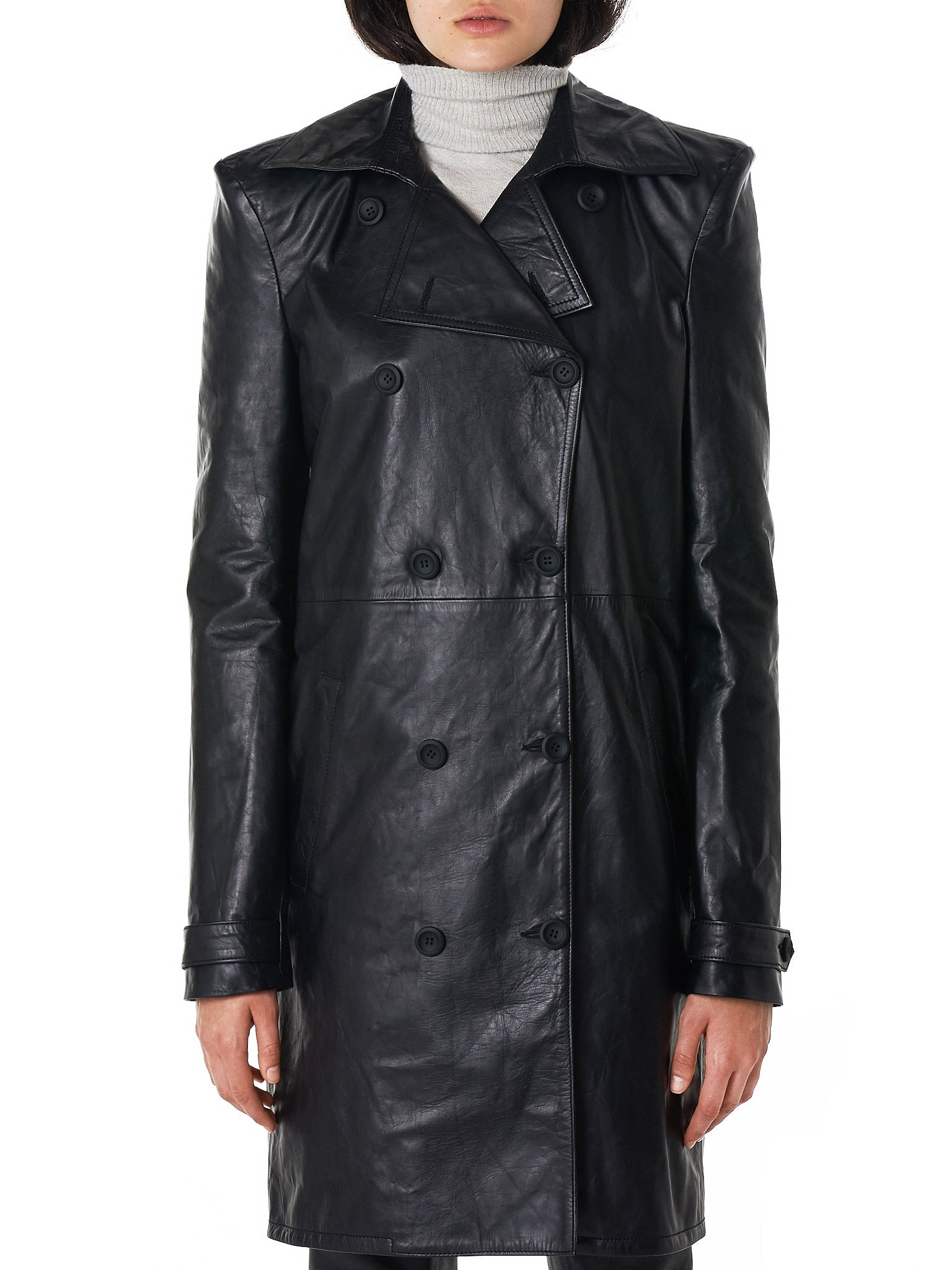 Unravel tailored double-breasted trench coat in black, viscose-cotton lining, vegetable-tanned crushed leather finish, notched lapel with buttonhole detail, front button closure, waist belt, side pockets, belted cuffs, vented rear, slim-fit, straight hem, tonal stitching. Made in Italy. Composition - 100% Leather; 51% Viscose, 49% Cotton (Lining) Model wears a size 40.